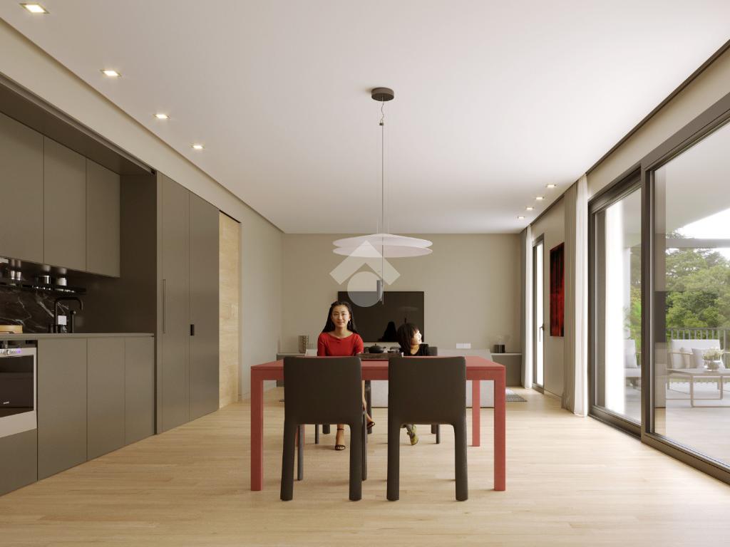 La soluzione dispone inoltre di una terrazza da 112mq parzialmente loggiata, box auto singolo e posto auto esterno doppio.