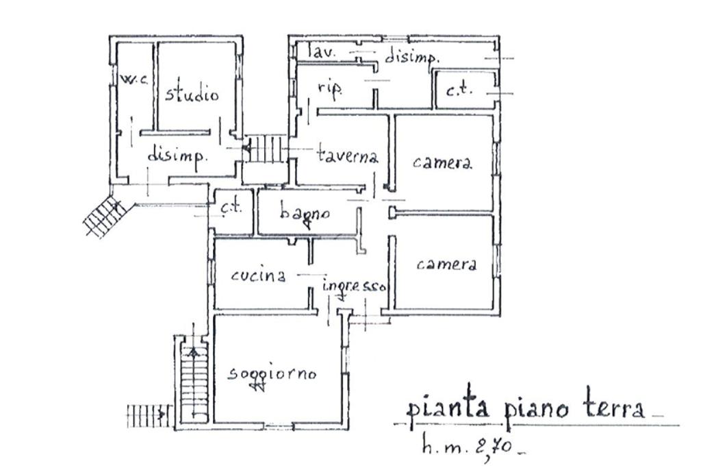 La prima unità abitativa, posta al piano terra, è composta da un ingresso di circa 9 mq, soggiorno con caminetto di circa 24 mq, cucina separata abitabile di circa 13 mq, due camere matrimoniali di circa 16 mq ciascuna, studio di circa 12 mq e due bagni finestrati con doccia rispettivamente di 7 mq e 5 mq.
