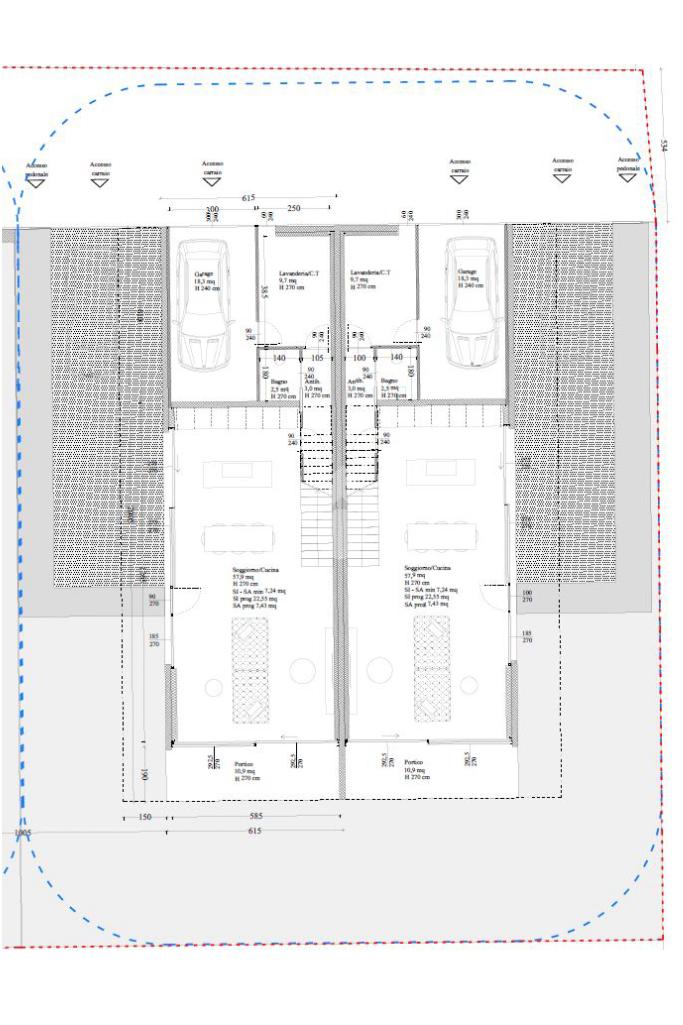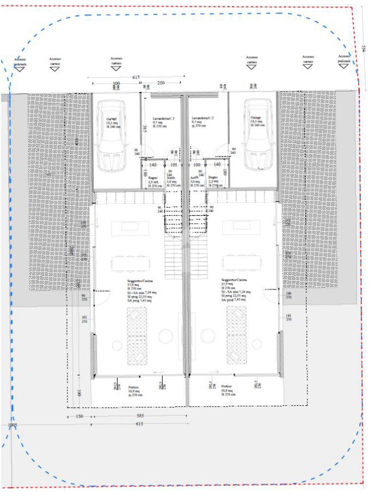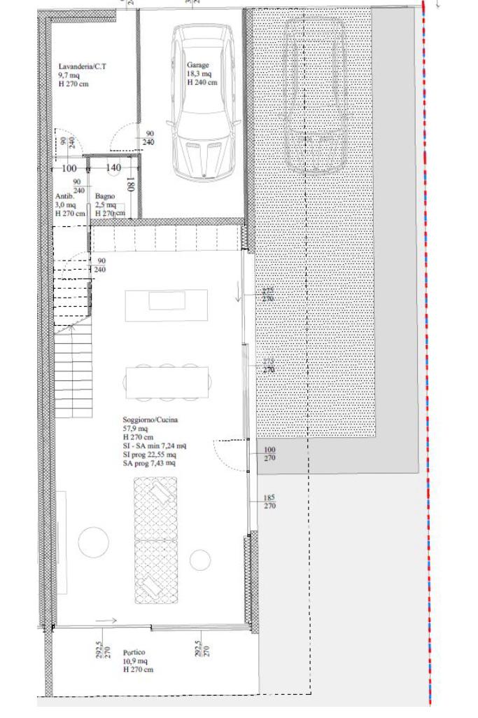 Piano terra: Zona giorno da 58mq con portico da 11mq esposto a sud, bagno, antibagno, lavanderia/centrale termica e garage da 18,3mq.