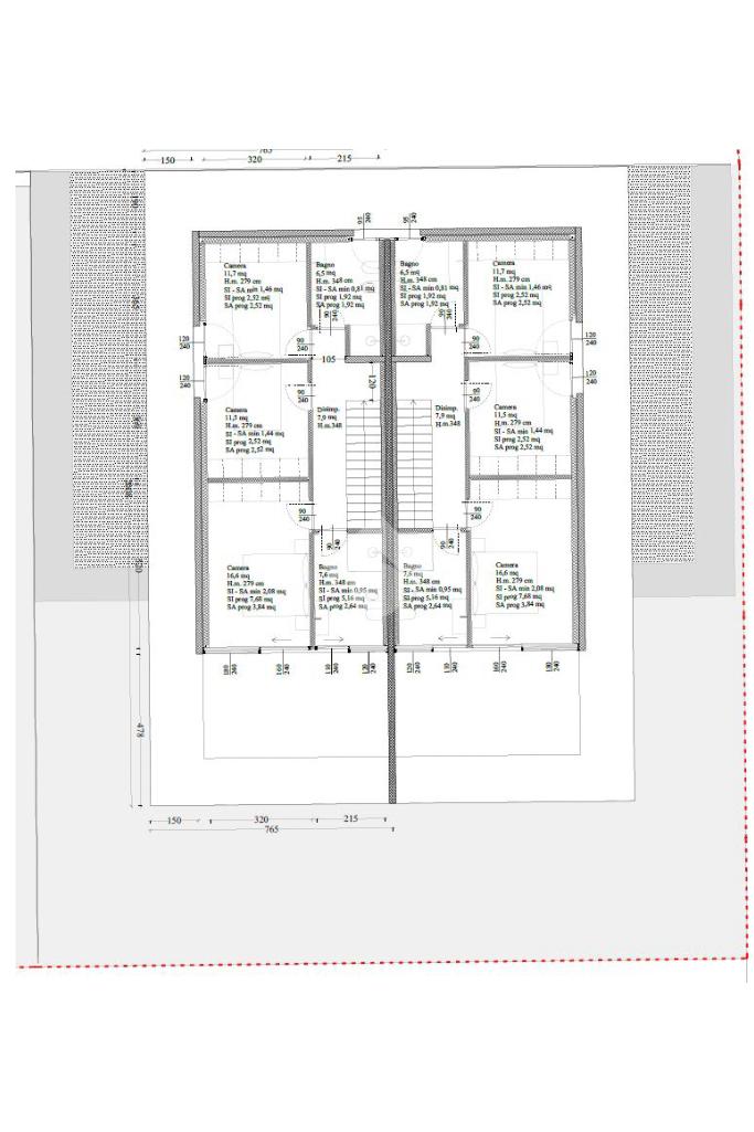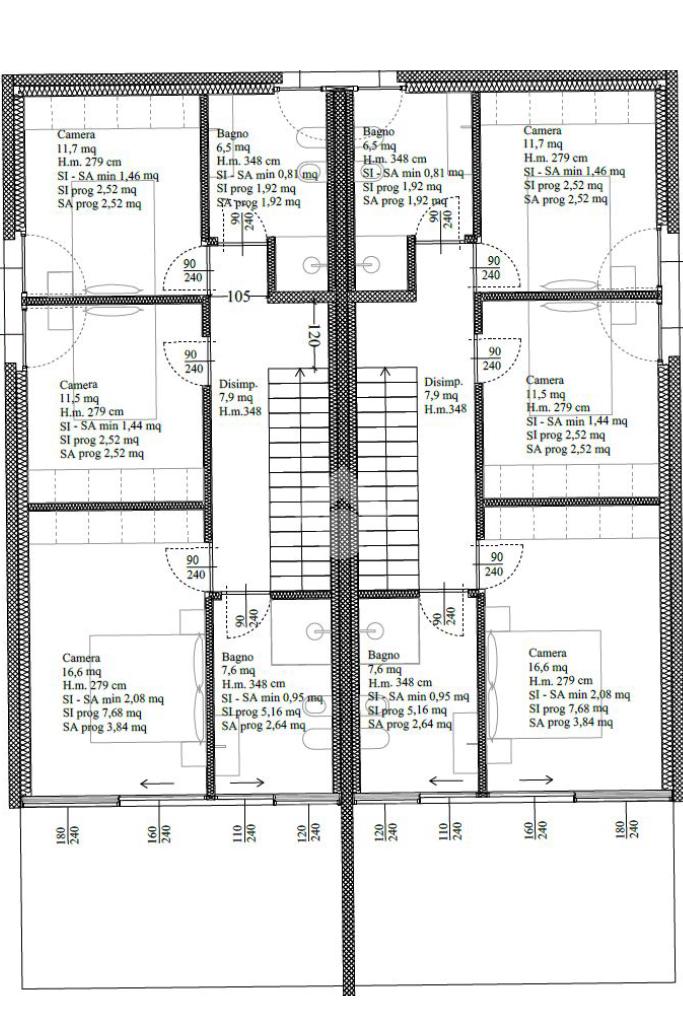 Piano primo: Disimpegno da 8mq, Camera matrimoniale da 16,6mq, due ampie camere singole da 11,7mq, 2 bagni da rispettivamente 7,6mq e 6,5mq.