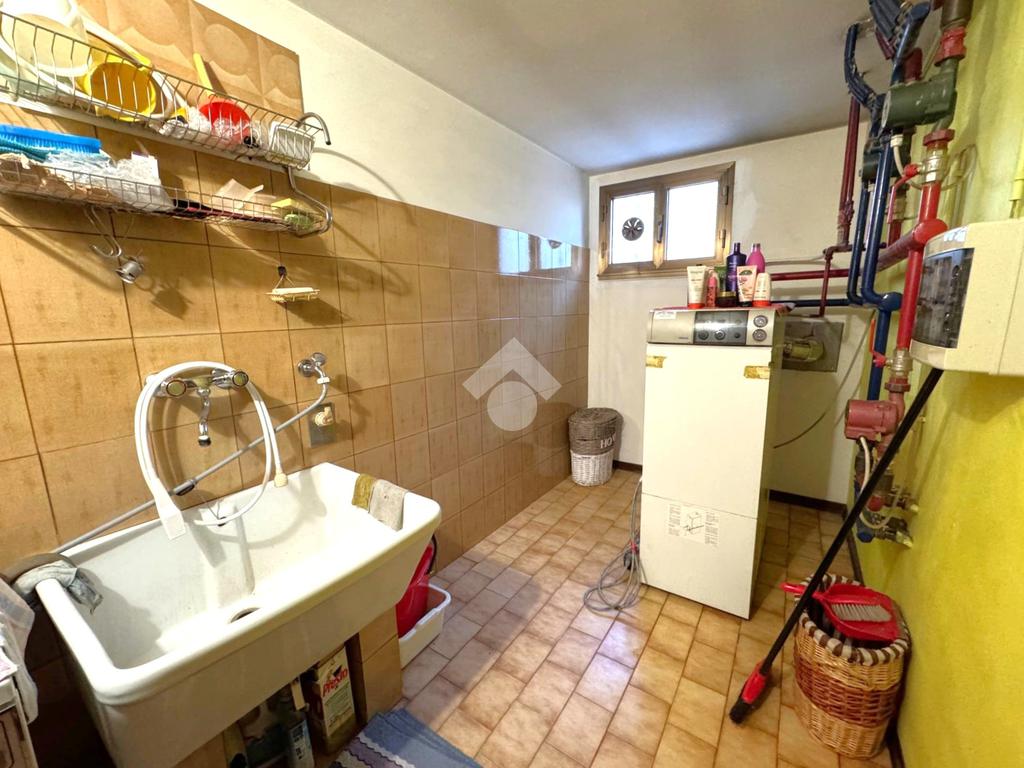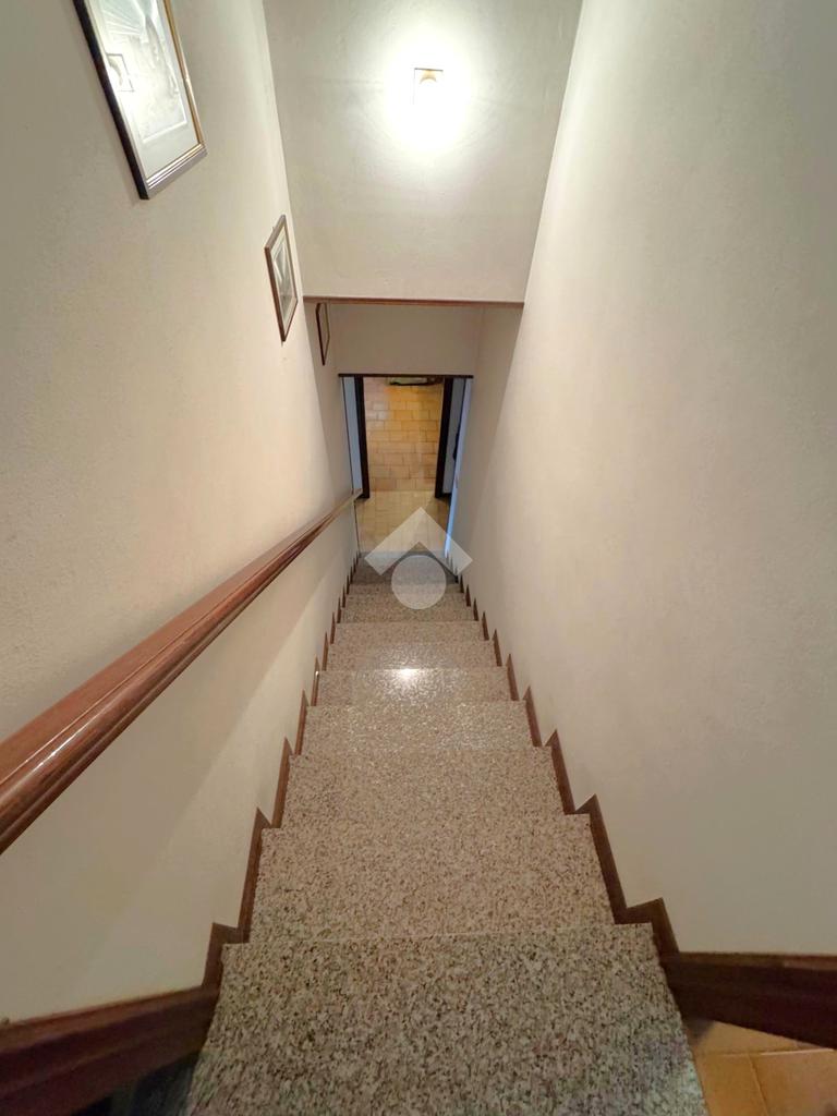 E dalla cucina e dall'esterno si accede al vano scala che porta al piano seminterrato composto da un corridoio di 5 mq, un ripostiglio da 13,7 mq, una stanza di 23 mq adibita a taverna con caminetto, un bagno finestrato con doccia da 6 mq, uno studio da 13,7 mq, la centrale termica e lavanderia da 6,9 mq, una cantina da 17,7 mq e il garage da 40,3 mq.
